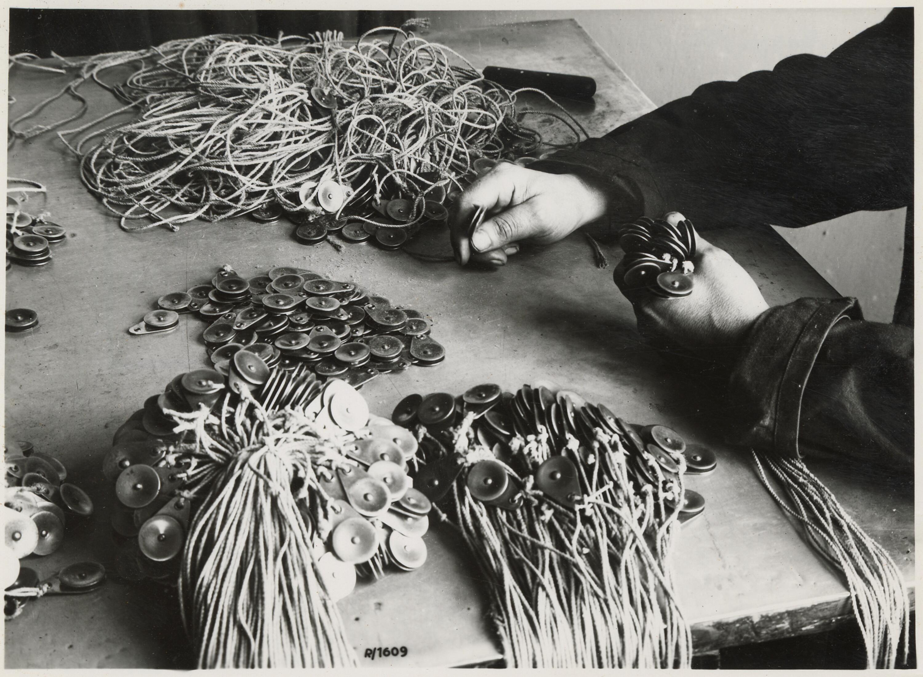 Fotografie, Kriegsblinde Mitarbeiter des Postamts der Deutschen Reichspost, München 3, beim Ordnen und Bündeln von Schnürösen, ; Museumsstiftung Post und Telekommunikation, Inventarnummer: 3.2024.176,