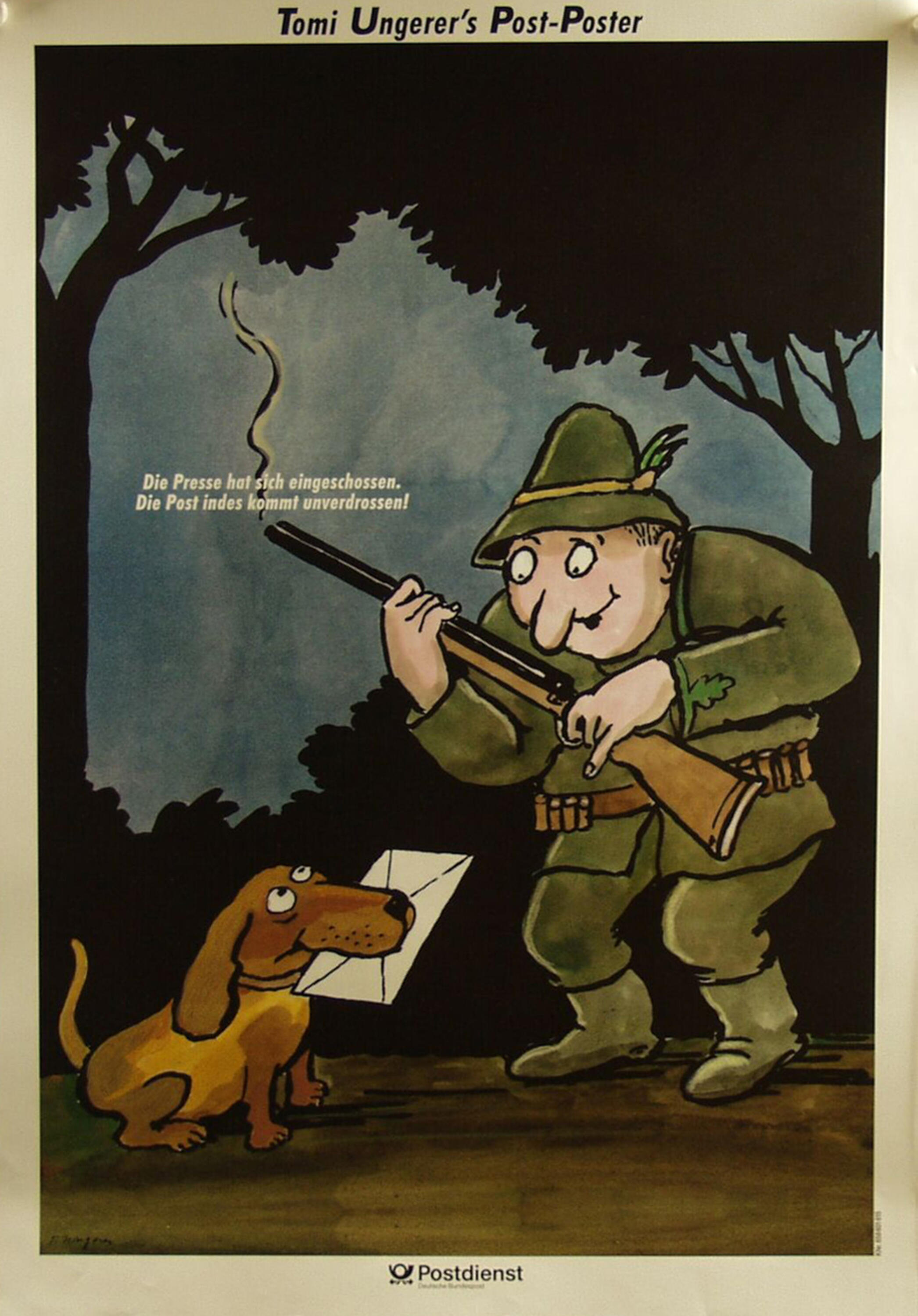 Plakat "Tomi Ungerer's Post-Poster: Die Presse hat sich eingeschossen. Die Post indes kommt unverdrossen!"