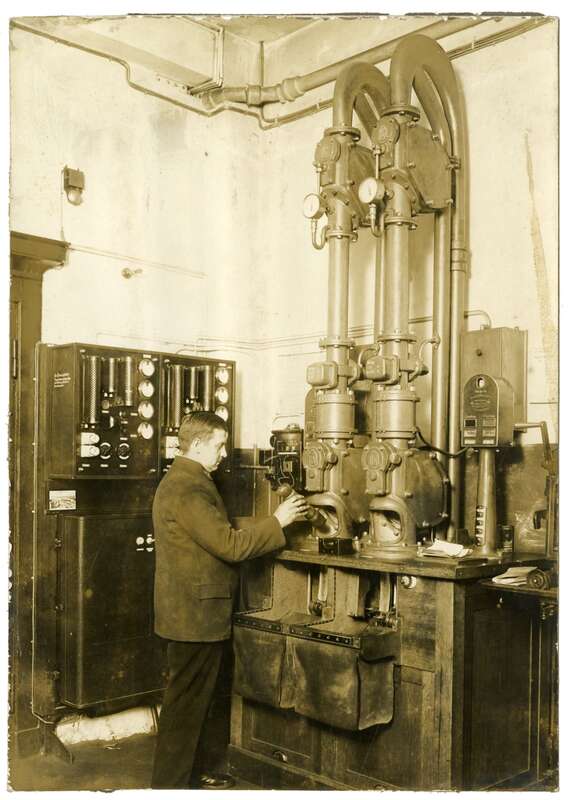 Fotografie; Mitarbeiter der Deutschen Reichspost beim Verpacken einer Rohrpoststendung in eine Rohrpostbüchse vor einer Rohrpostanlage des Systems Mix und Genest, Januar 1930; Museumsstiftung Post und Telekommunikation, Inventarnummer: 3.2009.2700,