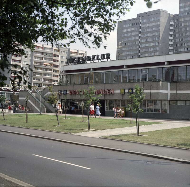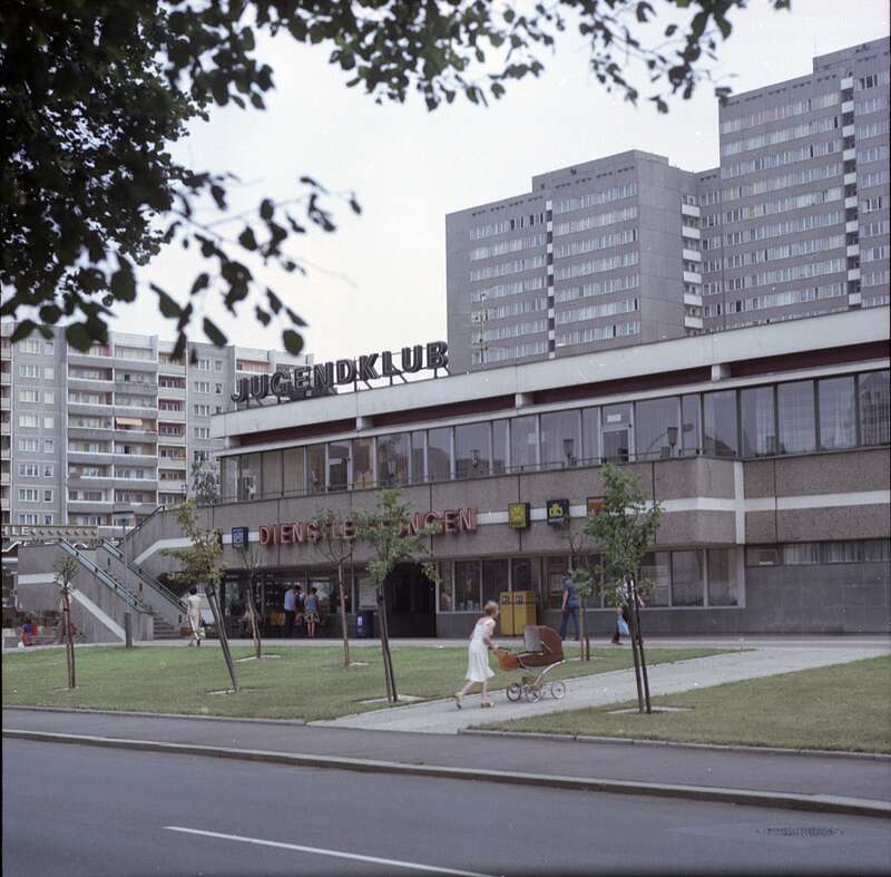 Fotografie, Außenansicht des Postamts der Deutschen Post der DDR 1075 Berlin 75, Greifswalder Straße 89, im Gebäude einer komplexen Dienstleistungseinrichtung, 06.1981; Museumsstiftung Post und Telekommunikation, Inventarnummer: 3.2018.1218,
