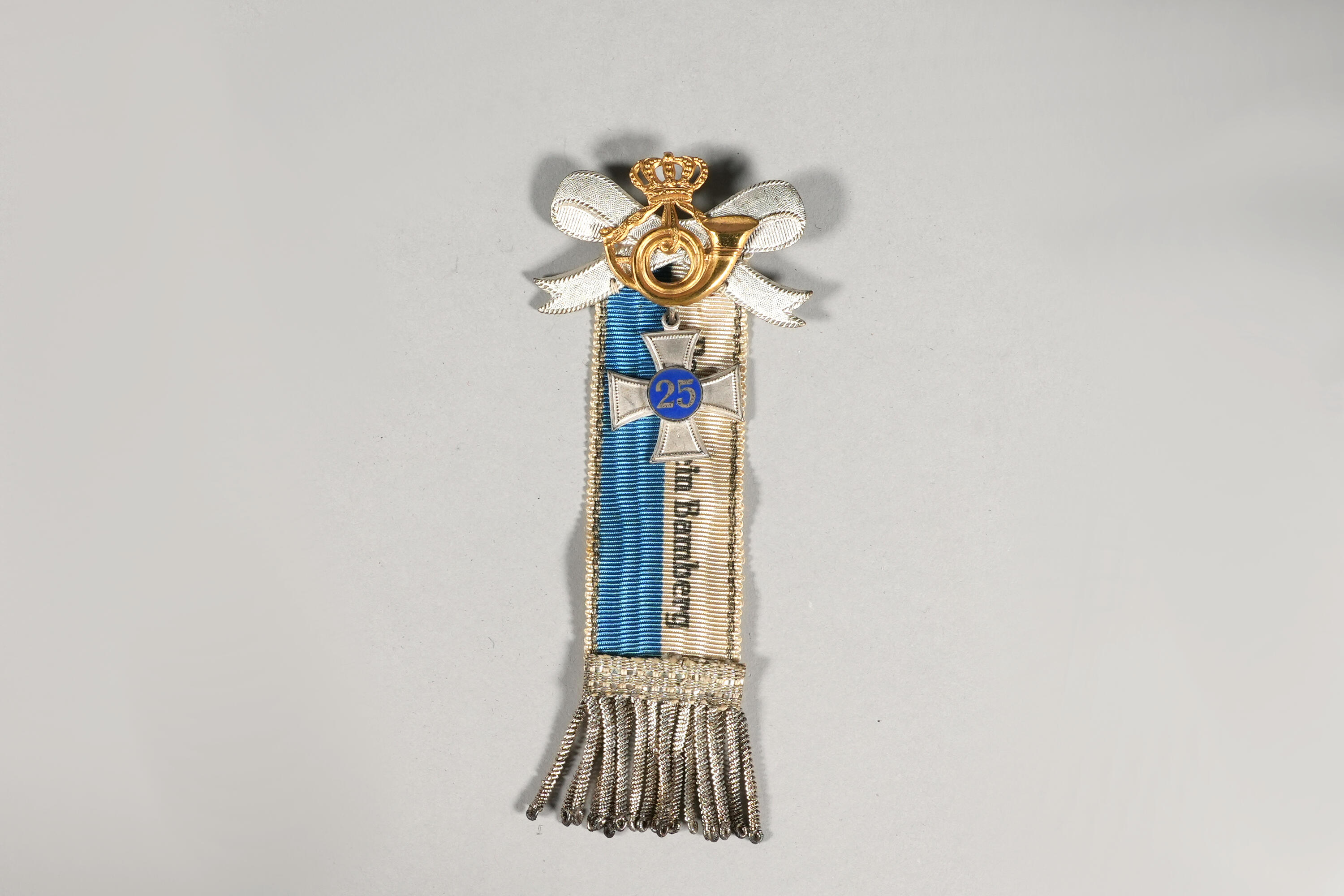 Silberfarbene Blechschleife mit goldfarbenem Posthorn und Krone aus Blech. darunter hängend weißes Kreuz mit "25". Herunterhängend weiß-blaues Textilband mit Aufschrift "Postverein Bamberg" und silberfarbenen Fransen.