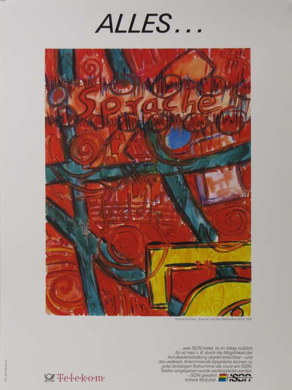 Plakat "Alles über ein Netz. Sprache - Text - Bild - Daten", Bilderzyklus ISDN 1991, 1991; Museumsstiftung Post und Telekommunikation, Inventarnummer: 4.2009.1298,