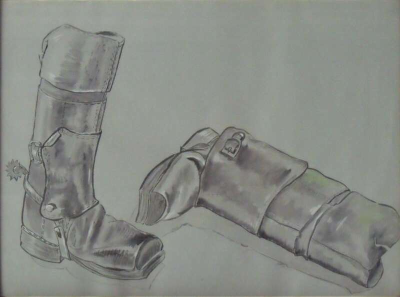 Sehr wuchtiger Stangenreiterstiefel aus dickem, hartem Leder, mit teerartiger Farbe überzogen; an der Oberseite vor dem Knie Stulpen aus etwas weicherem Leder; oben vorn in der Mitte ein Loch; Spore mit gezacktem Rädchen im Stiefel integriert und in der Knöchelverstärkung befestigt.