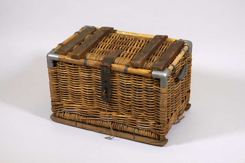 Fotografie, Mitarbeiter der Deutschen Bundespost mit Bahnsteigwagen beim Ladungsautausch an der Tür eines Bahnpostwagens der Bahnpost Stuttgart - Bremen, 1956; Museumsstiftung Post und Telekommunikation, Inventarnummer: 3.2012.5036,