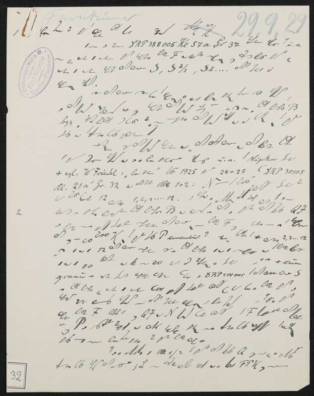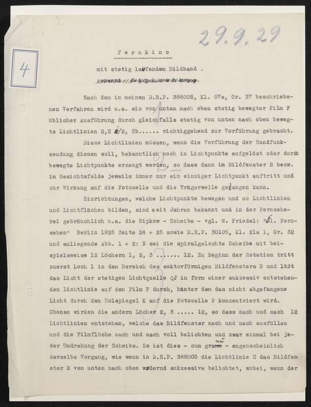 Manuskript zu Patentanmeldung N 30972 IX / 57a² "Fernkino mit stetig laufendem Bildband", 29.09.1929; Museumsstiftung Post und Telekommunikation, Inventarnummer: 4.2.145.82,