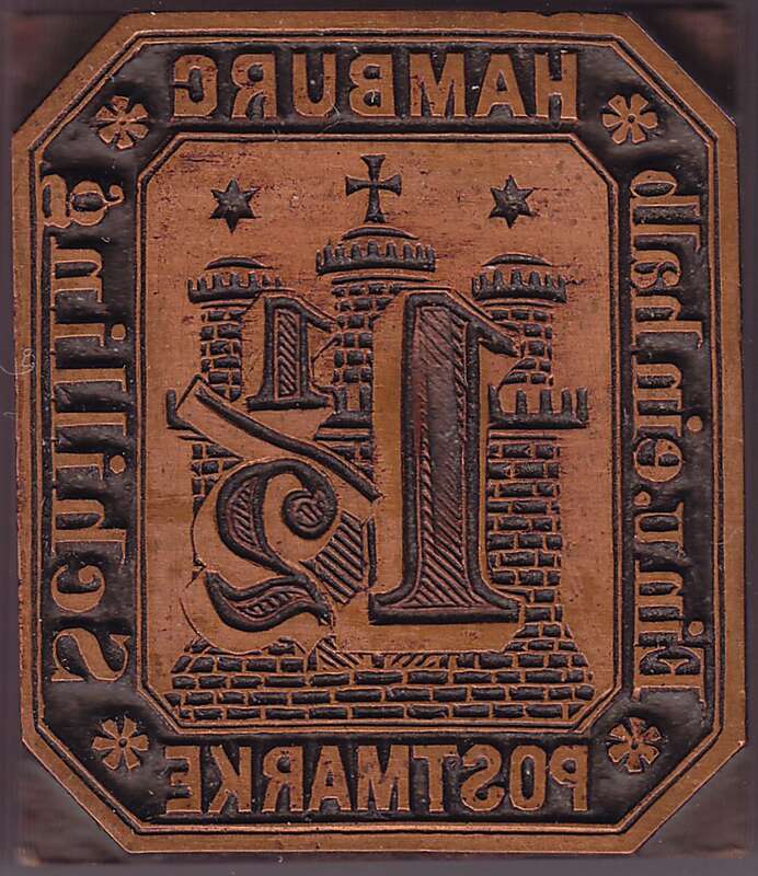 Druckstock: oben mitte "HAMBURG", unten mitte "POSTMARKE", rechts "ein u.einhalb", links "Schilling", mitte "1 1/2"