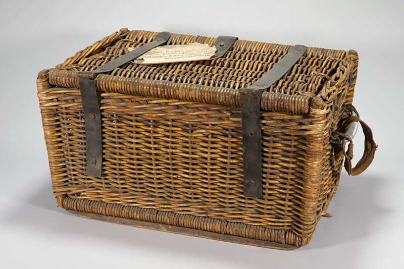 Geflochtene Kiste, Rahmen aus beigefarbenem Bambusrohr(?) mit vier Ecken aus Aluminium(?)-Steckverbindung geschützt und stabilisiert (darauf in erhabener Druckschrift "H. Leicher Heinsberg Rhld."), seitlich zwei bewegliche metallumwickelte Griffe. Korbdeckel mit zweikräftigen Holzlatten (340 mm lang), die in grauen Metallschlaufen auslaufen, nach oben hin geschützt, vorne stabiler Eisenüberwurfriegel, kein Schloß vorhanden.