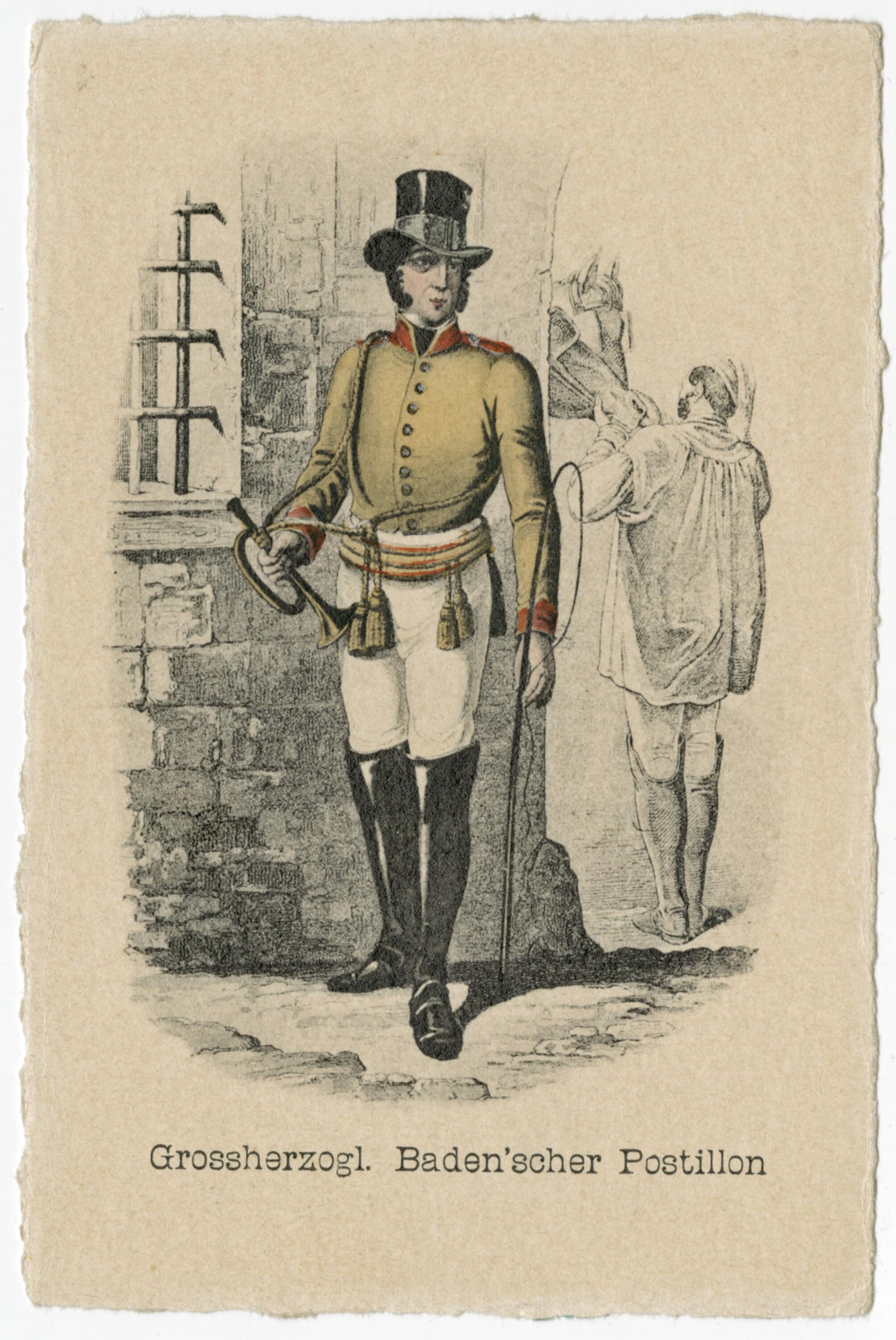Ansichtspostkarte; Grossherzoglich Badischer Postillon in Dienstkleidung, ungelaufen, um 1935; Museumsstiftung Post und Telekommunikation, Inventarnummer: 3.2013.1427,