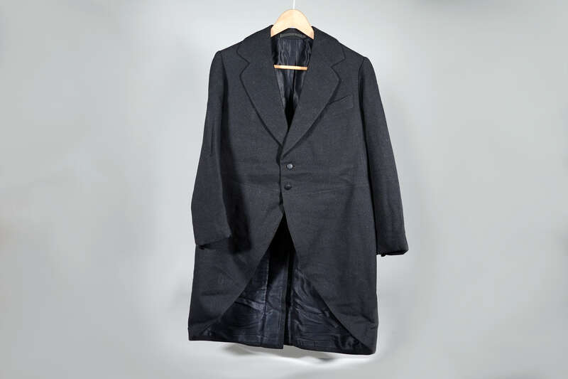 Fotografie, Gruppenaufnahme von Beamten der Kaiserlich Deutschen Reichspost in Dienstkleidung, mit Fahrrad und Zustellkarre vor dem Postgebäude, um 1910; Museumsstiftung Post und Telekommunikation, Inventarnummer: 3.2024.2262,
