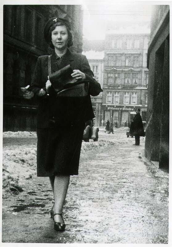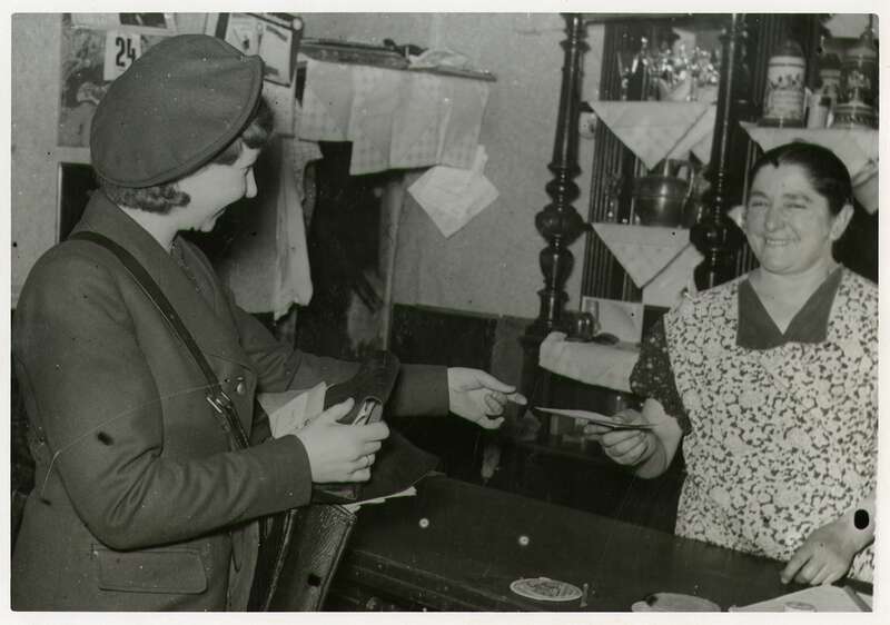 Die Zustellerin trägt eine Baskenmütze mit NS-Hoheitszeichen.
