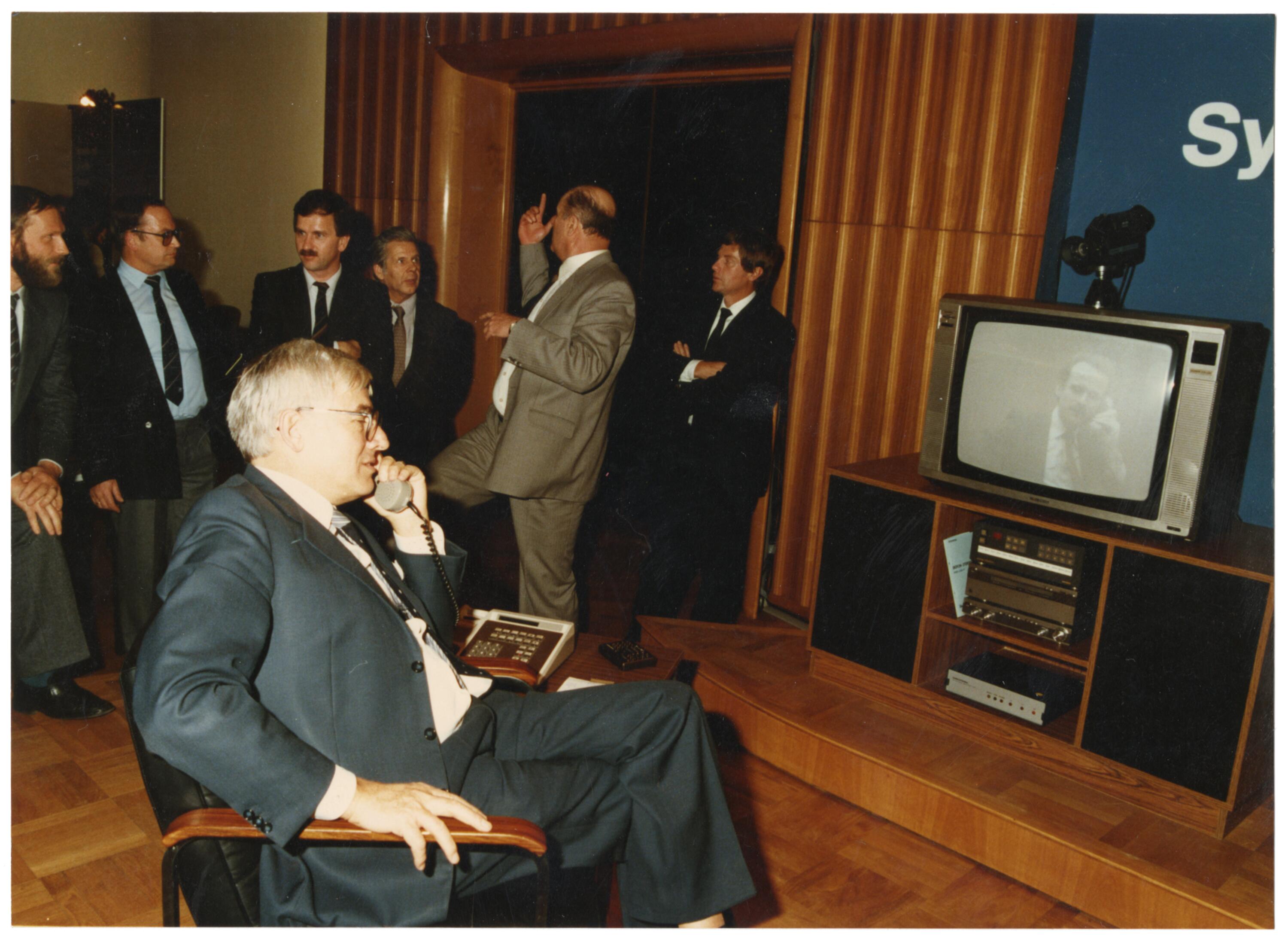 Fotografie, Bundesminister für Post und Telekommunikation, Dr. Christian Schwarz-Schilling während eines Fernsehtelefoniegesprächs mit dem Berliner Senator Volker Hassemer, um 1985; Museumsstiftung Post und Telekommunikation, Inventarnummer: 3.2021.1368,
