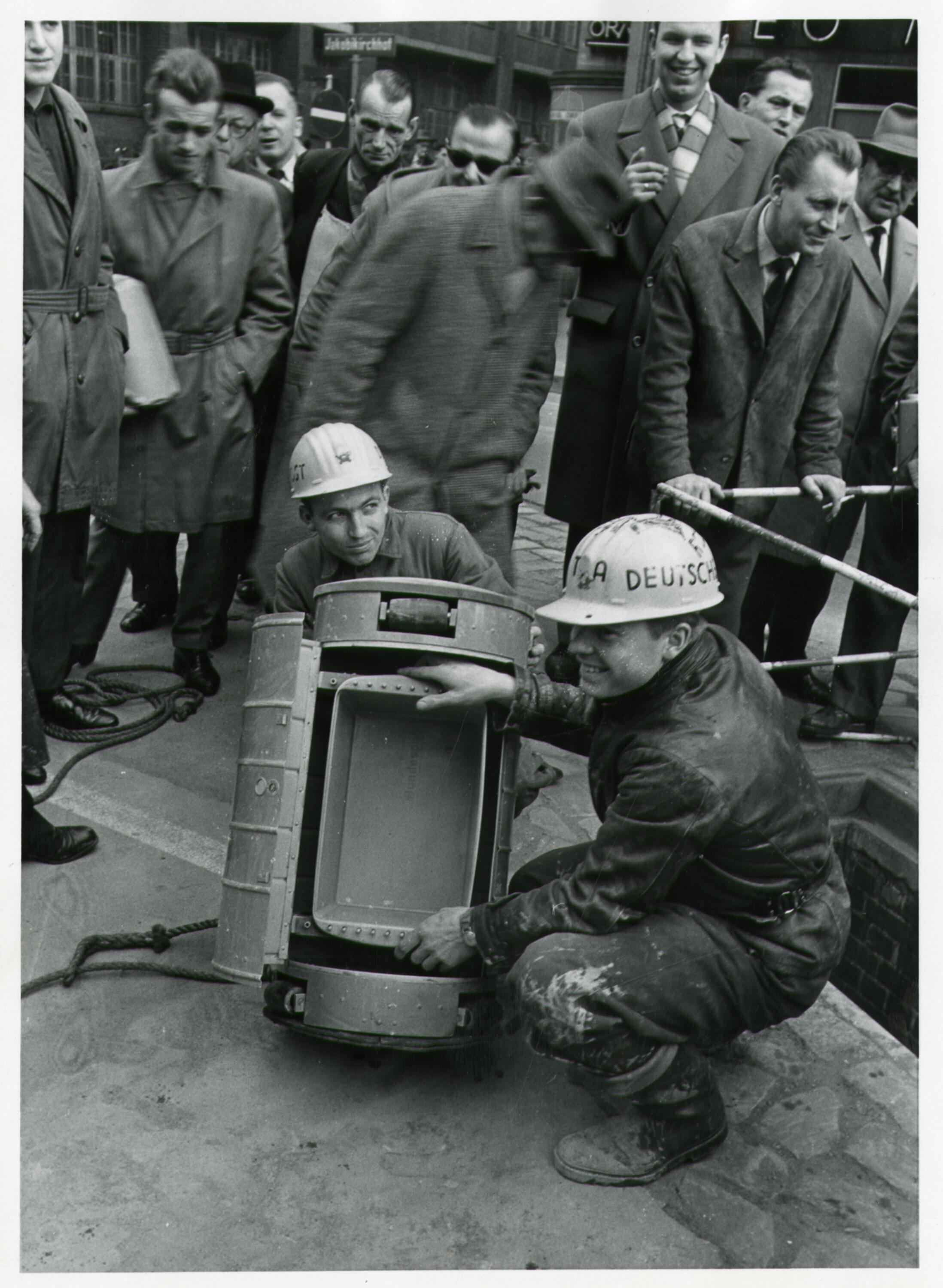 Fotografie; Großrohrpost der Deutschen Bundespost in Hamburg, erster öffentlicher Fahrversuch mit einem Rohrpostbehälter von der Sendestelle an der Jakobikirche