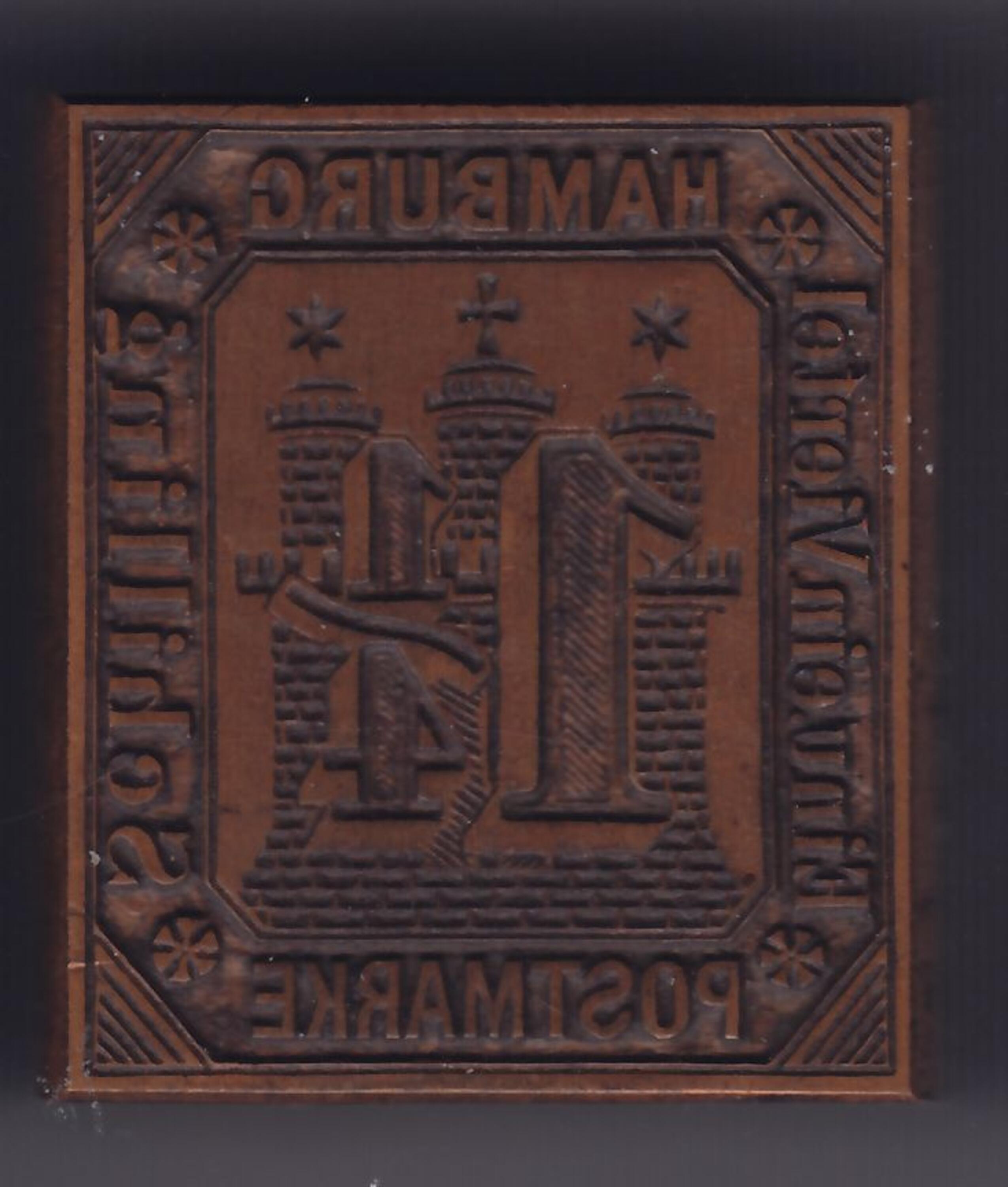 Druckstock: oben mitte "Hamburg", unten mitte "Postmarke", rechts "ein u. ein Viertel", links "Schilling", mitte "1 1/4"