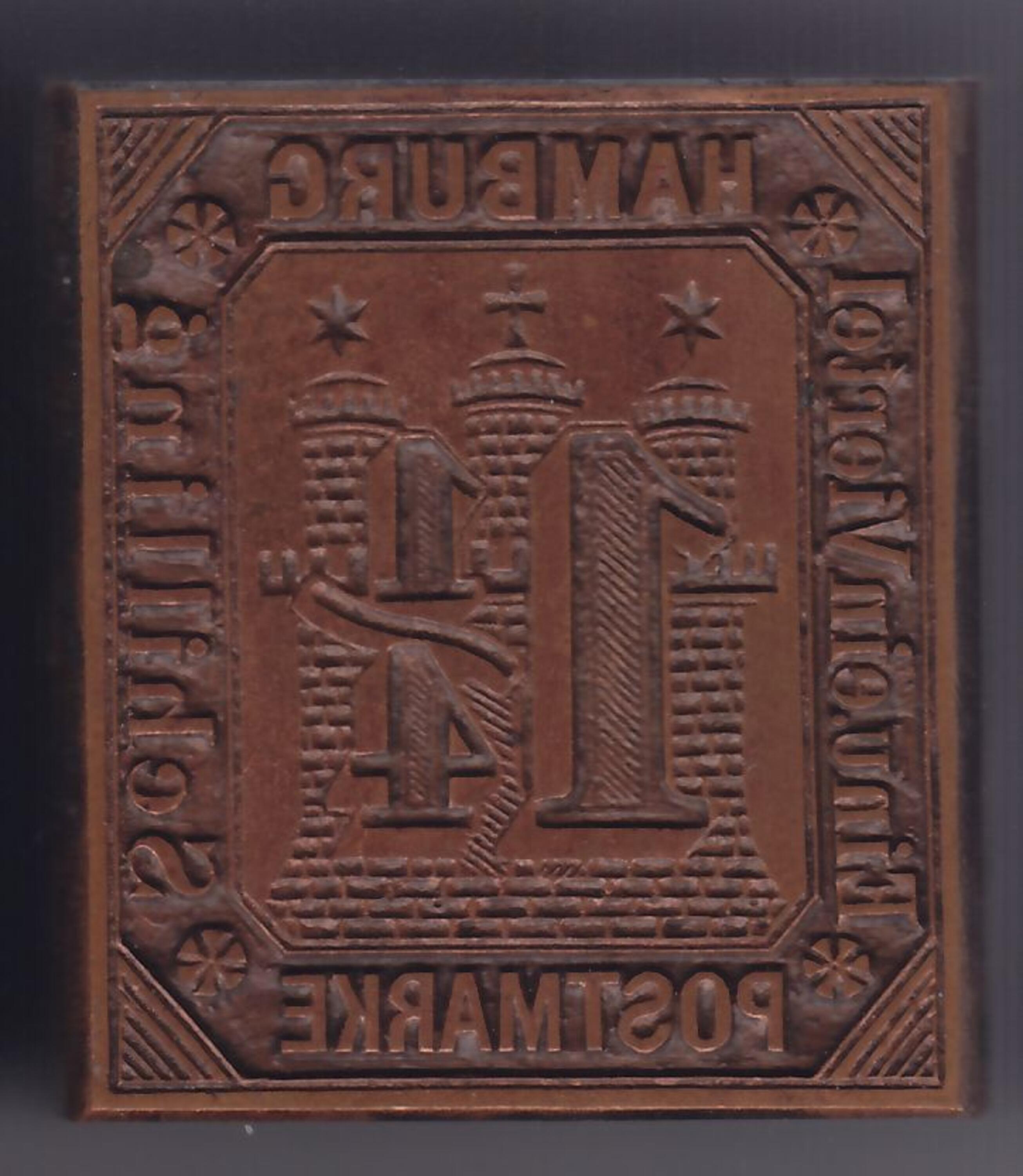 Druckstock für die Freimarke, Ganzsache Umschlag (Altdeutschland, Freie und Hansestadt Hamburg), 1 1/4 Schilling, MiNr. 20, U 2, ; Museumsstiftung Post und Telekommunikation, Inventarnummer: 3.2011.1589.6,
