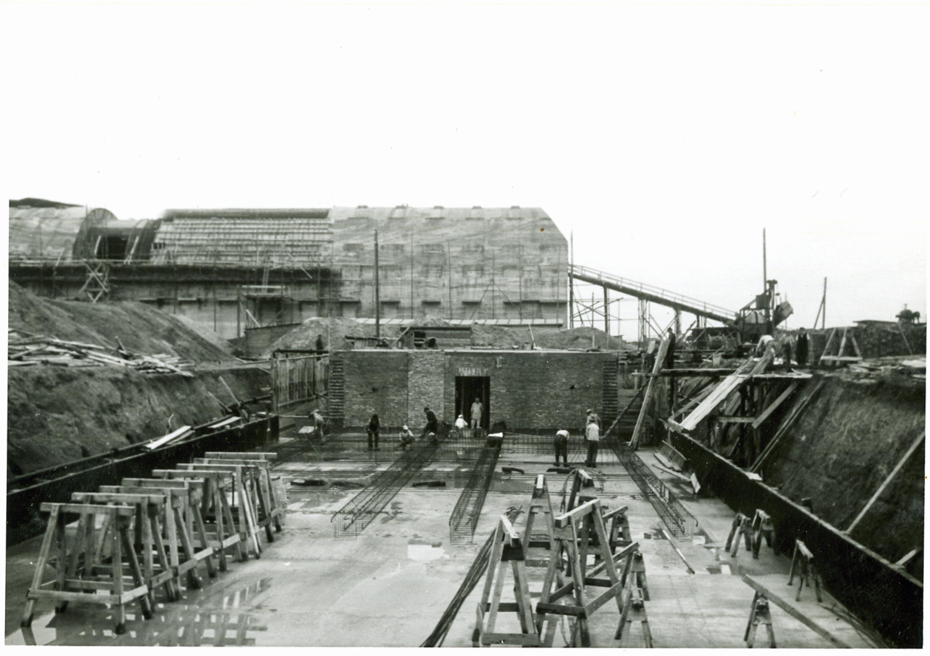 Fotografie; Bauarbeiten auf der Baustelle der Sendefunkstelle (FSSt) der Deutschen Reichspost in Oebisfelde, Fundamentarbeiten für das Werkstattgebäude (im Hintergrund der Gewölbebau), ; Museumsstiftung Post und Telekommunikation, Inventarnummer: 3.2013.612.13,