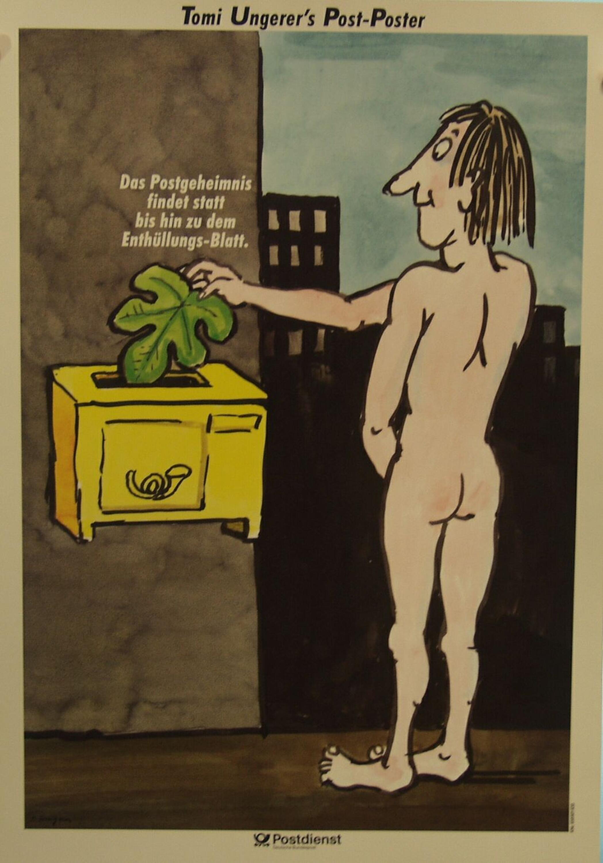 Plakat "Tomi Ungerer’s Post-Poster. Das Postgeheimnis findet statt bis hin zu dem Enthüllungs-Blatt", 1991; Museumsstiftung Post und Telekommunikation, Inventarnummer: 4.0.21969,