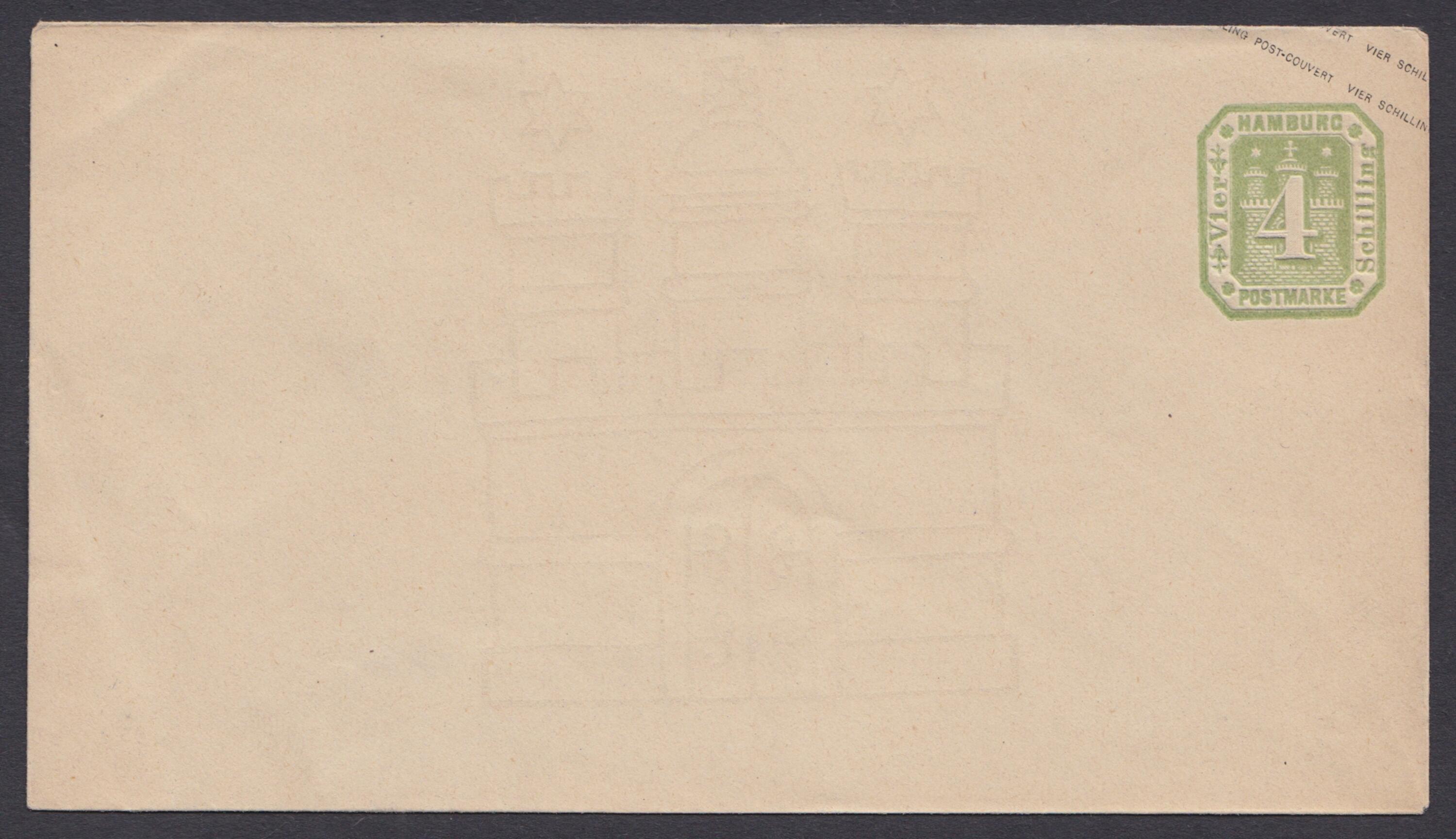 Ganzsachen-Umschlag mit eingepreßtem Wasserzeichen "Hamburger Wappen" mit links vier und rechts fünf Mauerzinnen (normal, von vorn gesehen) sowie Klappenstempel K2 (22teilig) als negativer Prägung.
