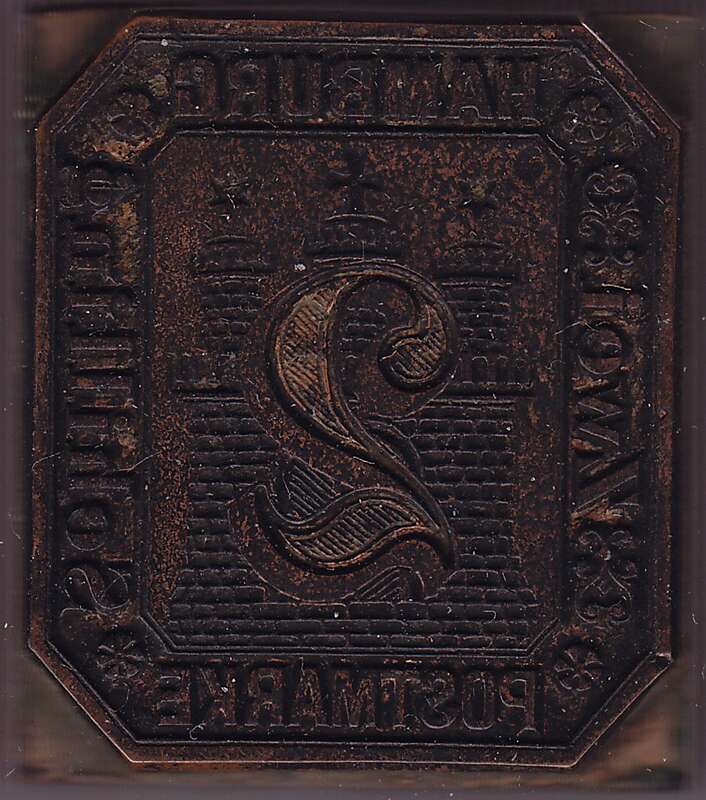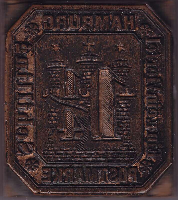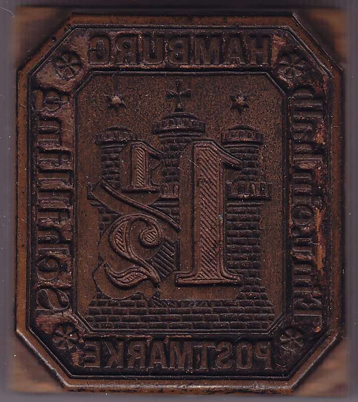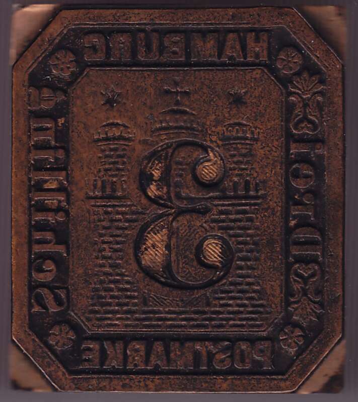 Druckstock: oben mitte "HAMBURG", unten mitte "POSTMARKE", rechts "ein halber" (bis:) "sieben", links "Schilling", mitte "1/2" (oder:) "1 1/4" (oder:) "1 1/2" (oder:) "2" (oder:) "3" (oder:) "4" (oder:) "7"