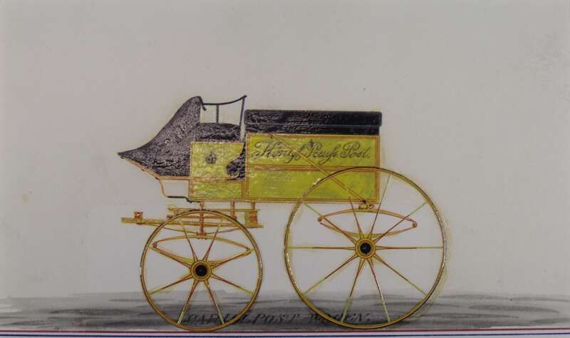 "(...) In Preußen war der Postwagenbau nach 1815 zunächst in Berlin und Düsseldorf zentralisiert. (...) Aus der 'Postwagen-Werkstatt zu Düsseldorf' sind eine Reihe von Konstruktionsplänen überliefert. Die kolorierten Tuschezeichnungen aus der Zeit um 1820 zeigen kobaltblaue, grüne, rote und hellgelbe Fahrzeuge.(...) Die Farbenvielfalt bestand noch in den vierziger Jahren fort. (...) Erst im Jahre 1850 änderten sich die Verhältnisse (...), eine Kroine wurde als Hoheitszeichen vorgesehen, und alle Wagengattungen erhielten einen postgelben Anstrich." (Cornelius Neutsch, Gelb - Tradition der Post? Postfarben seit dem 18. Jahrhundert, in: Archiv für deutsche Postgeschichte, Heft 1/1994, S. 84)