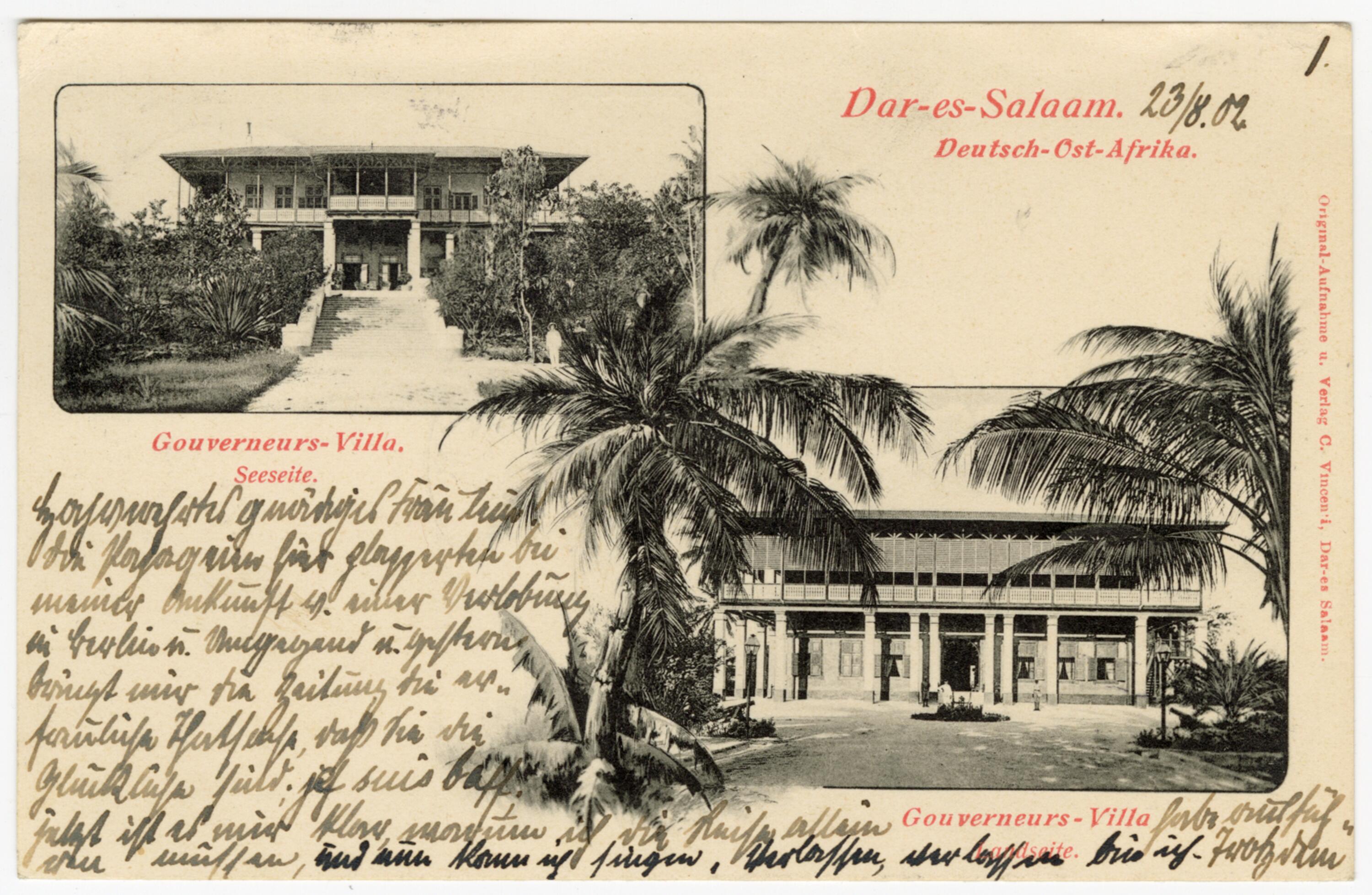 Ansichtspostkarte, Daressalam/Deutsch-Ostafrika, Außenansichten der Gouverneursvilla, gelaufen, 1902; Museumsstiftung Post und Telekommunikation, Inventarnummer: 3.2024.1000,