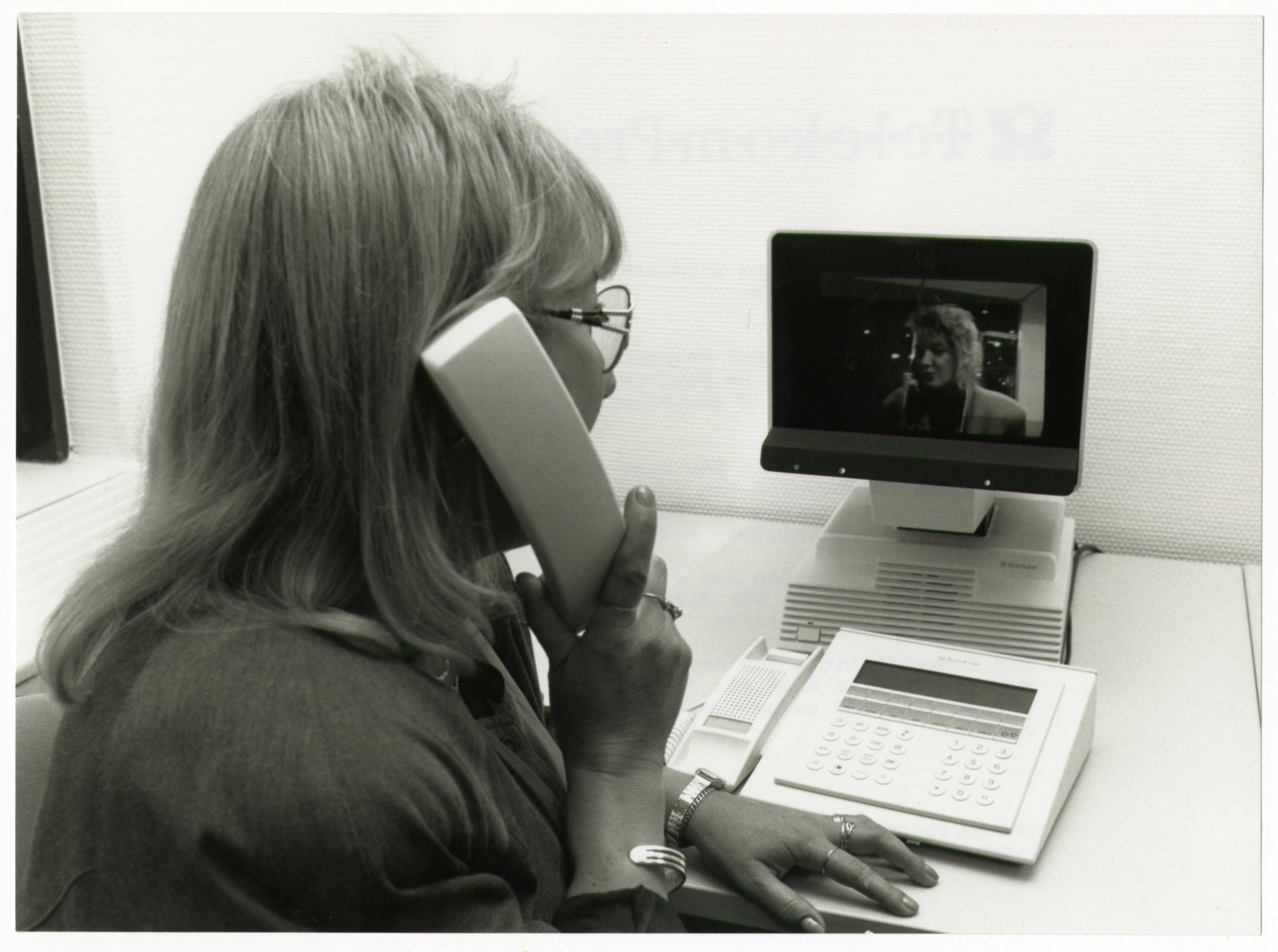 Fotografie; Frau bei Telefonieren mit einen ISDN-Bildtelefon der Deutschen Bundespost Telekom