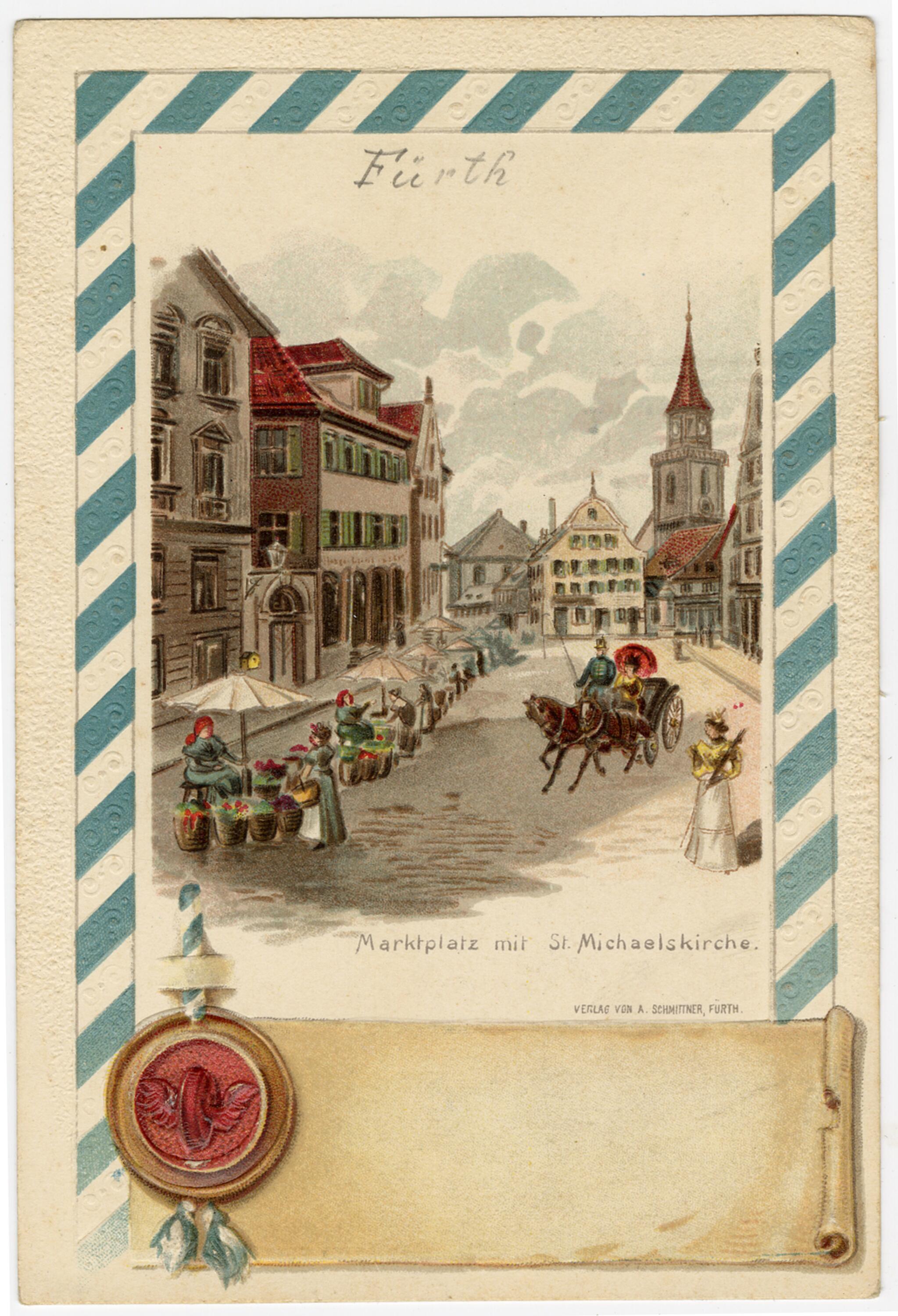 Ansichtspostkarte, Fürth, Marktplatz mit St. Michaelskirche, umrahmt von einem weiß-blauen Band mit Lacksiegeldarstellung, gelaufen, ; Museumsstiftung Post und Telekommunikation, Inventarnummer: 3.2022.3101,
